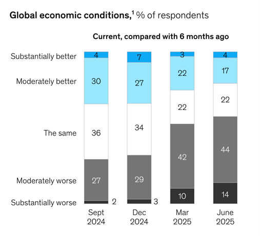 - Investor Sentiment: 46% of PE firms plan to increase investments in 2025, 44% aim to maintain levels, and only 10% expect to reduce activity. However, caution persists due to hazy buyout deal outlooks, as noted by industry giants like Blackstone and Apollo. (source: PWC). The April announcement about Trump’s tariffs has clearly impacted investors’ sentiment about global economic conditions as visible in the graph below: